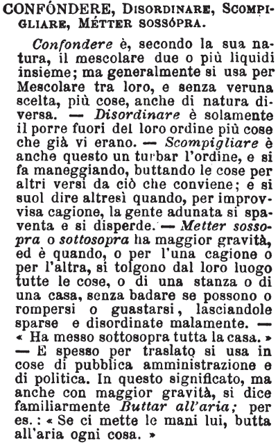 | Confondere, Disordinare, Scompigliare, Metter sossopra - Confondere è, secondo la sua natura, il mescolare due o più liquidi insieme; ma generalmente si usa per Mescolare tra loro, e senza veruna scelta, più cose, anche di natura diversa. - Disordinare è solamente il porre fuori del loro ordine più cose che già vi erano. - Scompigliare è anche questo un turbar l'ordine, e si fa maneggiando, buttando le cose per altri versi da ciò che conviene; e si suol dire altresì quando, per improvvisa cagione, la gente adunata si spaventa e si disperde. - Metter sossopra o sottosopra ha maggior gravità, ed è quando, o per l'una cagione o per l'altra, si tolgono dal loro luogo tutte le cose, o di una stanza o di una casa, senza badare se possono o rompersi o guastarsi, lasciandole sparse e disordinate malamente. - «Ha messo sottosopra tutta la casa.» - E spesso per traslato si usa in cose di pubblica amministrazione e di politica. In questo significato, ma anche con maggior gravità, si dice familiarmente Buttar all'aria; per es.: «Se ci mette le mani lui, butta all'aria ogni cosa.» [immagine] |