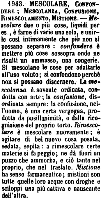 | Mescolare, Confondere; Mescolanza, Confusione, Rimescolamento, Mistione - Mescolare due o più cose, liquidi per es., è farne di varie una sola, e unirle così intimamente che più non si possano separare: confondere è mettere più cose sossopra onde ne risulti un ammasso, una congerie. Si mescolano le cose per adattarle all'uso voluto; si confondono perchè non si possano discernere. La mescolanza è sovente ordinata, condotta con arte; la confusione, disordinata sempre: la confusione, nell'uomo, è una certa vergogna, prodotta da pusillanimità, o dalla ricognizione del proprio torto. Rimescolare è mescolare nuovamente; è agitare di bel nuovo cosa posata, sedata, sopita: a rimescolare certe materie si fa peggio; ne dà fuori un puzzo che ammorba, e ciò tanto nel proprio, che nel traslato. Mistione ha senso farmaceutico; mistioni son tutte quelle loro acque con droghe e sciloppi una più cattiva e nauseante dell'altra. [immagine] |
