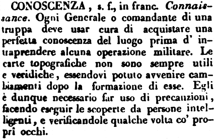 | Conoscenza - s. f., in franc. Connaissance. Ogni Generale o comandante di una truppa deve usar cura di acquistare una perfetta conoscenza del luogo prima d'intraprendere alcuna operazione militare. Le carte topografiche non sono sempre utili o veridiche, essendovi potuto avvenire cambiamenti dopo la formazione di esse. Egli è dunque necessario far uso di precauzioni, facendo eseguir le scoperte da persone intelligenti, e verificandole qualche volta co' propri occhi. [immagine] |