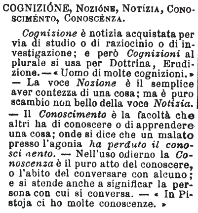 | Cognizione, Nozione, Notizia, Conoscimento, Conoscenza - Cognizione è notizia acquistata per via di studio o di raziocinio o di investigazione; e però Cognizioni al plurale si usa per Dottrina, Erudizione. - « Uomo di molte cognizioni. » - La voce Nozione è il semplice aver contezza di una cosa; ma è puro scambio non bello della voce Notizia. - Il Conoscimento è la facoltà che altri ha di conoscere o di apprendere una cosa; onde si dice che un malato presso l'agonia ha perduto il conoscimento. - Nell'uso odierno la Conoscenza è il puro atto del conoscere, o l'abito del conversare con alcuno; e si stende anche a significar la persona con cui si conversa. - « In Pistoja ci ho molte conoscenze. » [immagine] |