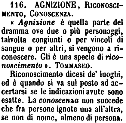 Agnizione, Riconoscimento, Conoscenza - «Agnizione è quella parte del dramma ove due o più personaggi, talvolta congiunti o per vincoli di sangue o per altri, si vengono a riconoscere. Gli è una specie di riconoscimento». Tommaseo.
