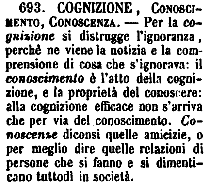 | Cognizione, Conoscimento, Conoscenza - Per la cognizione si distrugge l'ignoranza, perchè ne viene la notizia e la comprensione di cosa che s'ignorava: il conoscimento è l'atto della cognizione, e la proprietà del conoscere: alla cognizione efficace non s'arriva che per via del conoscimento. Conoscenze diconsi quelle amicizie, o per meglio dire quelle relazioni di persone che si fanno e si dimenticano tuttodì in società. [immagine] |