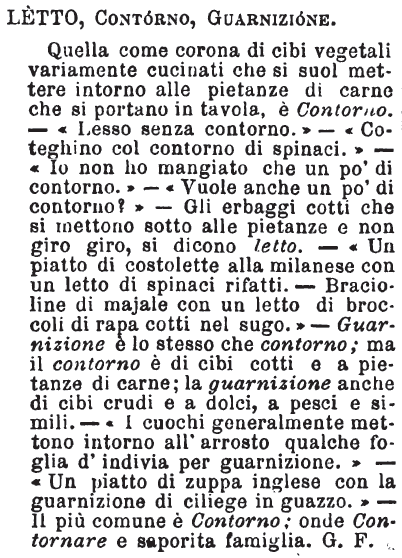 | Letto, Contorno, Guarnizione - Quella come corona di cibi vegetali variamente cucinati che si suol mettere intorno alle pietanze di carne che si portano in tavola, è Contorno. - «Lesso senza contorno.» - «Coteghino col contorno di spinaci.» - «Io non ho mangiato che un po' di contorno.» - «Vuole anche un po' di contorno?» - Gli erbaggi cotti che si mettono sotto alle pietanze e non giro giro, si dicono letto. - «Un piatto di costolette alla milanese con un letto di spinaci rifatti. - Bracioline di majale con un letto di broccoli di rapa cotti nel sugo.» - Guarnizione è lo stesso che contorno; ma il contorno è di cibi cotti e a pietanze di carne; la guarnizione anche di cibi crudi e a dolci, a pesci e simili. - «I cuochi generalmente mettono intorno all'arrosto qualche foglia d'indivia per guarnizione.» - «Un piatto di zuppa inglese con la guarnizione di ciliege in guazzo.» - Il più comune è Contorno; onde Contornare e saporita famiglia. G. F. [immagine] |