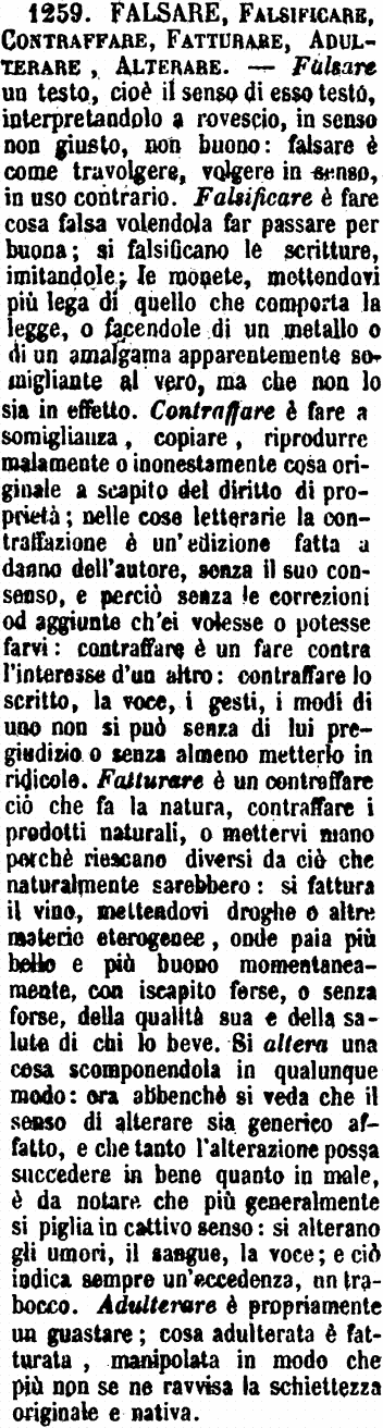 | Falsare, Falsificare, Contraffare, Fatturare, Adulterare, Alterare - Falsare un testo, cioè il senso di esso testo, interpretandolo a rovescio, in senso non giusto, non buono: falsare è come travolgere, volgere in senso, in uso contrario. Falsificare è fare cosa falsa volendola far passare per buona; si falsificano le scritture, imitandole; le monete, mettendovi più lega di quello che comporta la legge, o facendole di un metallo o di un amalgama apparentemente somigliante al vero, ma che non lo sia in effetto. Contraffare è fare a somiglianza, copiare, riprodurre malamente o inonestamente cosa originale a scapito del diritto di proprietà; nelle cose letterarie la contraffazione è un’edizione fatta a danno dell’autore, senza il suo consenso, e perciò senza le correzioni od aggiunte che ch’ei volesse o potesse farvi: contraffare è un fare contra l’interesse d'un altro: contraffare lo scritto, la voce, i gesti, i modi di uno non si può senza di lui pregiudizio o senza almeno metterlo in ridicolo. Fatturare è un contraffare ciò che fa la natura, contraffare i prodotti naturali, o mettervi mano perché riescano diversi da ciò che naturalmente sarebbero: si fattura il vino, mettendovi droghe o altre materie eterogenee, onde paia più bello e più buono momentaneamente, con iscapito forse, o senza forse, della qualità sua e della salute di chi lo beve. Si altera una cosa scomponendola in qualunque modo: ora abbenchè si veda che il senso di alterare sia generico affatto, e che tanto l’alterazione possa succedere in bene quanto in male, è da notare che più generalmente si piglia in cattivo senso: si alterano gli umori, il sangue, la voce; e ciò indica sempre un’eccedenza, un trabocco. Adulterare è propriamente un guastare; cosa adulterata è fatturata, manipolata in modo che più non se ne ravvisa la schiettezza originale e nativa. [immagine] |