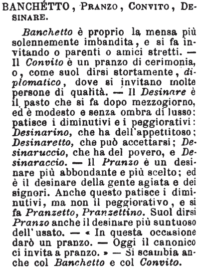 | Banchetto, Pranzo, Convito, Desinare - Banchetto è proprio la mensa più solennemente imbandita, e si fa invitando o parenti o amici stretti. - Il Convito è un pranzo di cerimonia, o, come suol dirsi stortamente, diplomatico, dove si invitano molte persone di qualità. - Il Desinare è il pasto che si fa dopo mezzogiorno, ed è modesto e senza ombra di lusso: patisce i diminutivi e i peggiorativi: Desinarino , che ha dell'appetitoso; Desinaretto, che può accettarsi; Desinaruccio, che ha del povero, e Desinaraccio. - Il Pranzo è un desinare più abbondante e più scelto; ed è il desinare della gente agiata e dei signori. Anche questo patisce i diminutivi, ma non il peggiorativo, e si fa Pranzetto, Pranzettino. Suol dirsi Pranzo anche il desinare più suntuoso dell'usato. - «In questa occasione darò un pranzo. - Oggi il canonico ci invita a pranzo.» - Si scambia anche col Banchetto e col Convito. [immagine] |