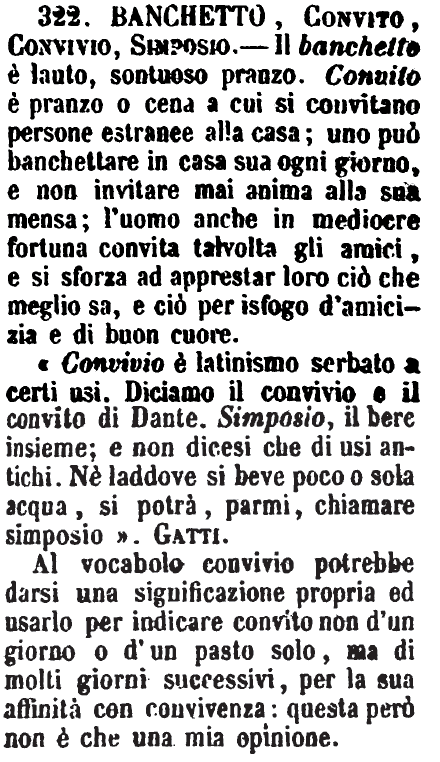 «Convivio è latinismo serbato a certi usi. Diciamo il convivio e il convito di Dante. Simposio, il bere insieme; e non dicesi che di usi antichi. Nè laddove si beve poco o sola acqua, si potrà, parmi, chiamare simposio». Gatti.