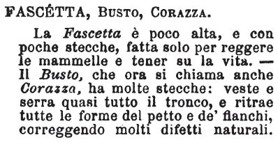 | Fascetta, Busto, Corazza - La Fascetta è poco alta, e con poche stecche, fatta solo per reggere le mammelle e tener su la vita. - Il Busto, che ora si chiama anche Corazza, ha molte stecche: veste e serra quasi tutto il tronco, e ritrae tutte le forme del petto e de' fianchi, correggendo molti difetti naturali. [immagine] |