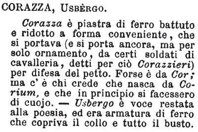 | Corazza, Usbergo - Corazza è piastra di ferro battuto e ridotto a forma conveniente, che si portava (e si porta ancora, ma per solo ornamento, da certi soldati di cavalleria, detti per ciò Corazzieri) per difesa del petto. Forse è da Cor; ma c'è chi crede che nasca da Corium, e che in principio si facessero di cuojo. - Usbergo è voce restata alla poesia, ed era armatura di ferro che copriva il collo e tutto il busto. [immagine] |