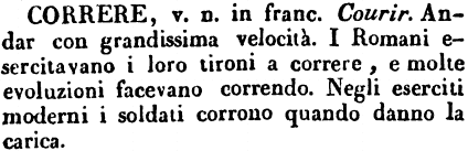 | Correre - v.n. in franc. Courir. Andar con grandissima velocità. I Romani esercitavano i loro tironi a correre, e molte evoluzioni facevano correndo. Negli eserciti moderni i soldati corrono quando danno la carica. [immagine] |