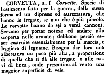 | Corvetta - S. f. (Mar.) [Fin.] Bastimento da guerra a tre alberi a coffe e colla batteria scoperta; se questa fosse coperta, il bastimento sarebbe una fregata, piccola o grande, quantunque non avesse batteria in coperta. |