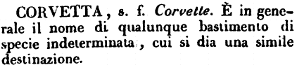 | Corvetta - s. f. Corvette. È in generale il nome di qualunque bastimento di specie indeterminata, cui si dia una simile destinazione. [immagine] |