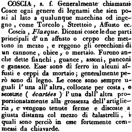 Coscia, Flasque. Diconsi cosce le due parti principali d'un affusto o ceppo che mettono in mezzo, e reggono gli orecchioni di un cannone, obice, o mortaio. Furono anche dette fianchi, guance, assoni, panconi e ganasce. Esse sono di ferro in alcuni affusti e ceppi da mortaio; generalmente però sono di legno. Le cosce sono sempre uguali l'una all'altra, collocate per costa, e scostate (écartées) l'una dall'altra proporzionatamente alla grossezza dell'artiglieria, e vengono tenute ferme e discoste a giusta distanza col mezzo di calastrelli, i quali sono perciò in esse fortemente commessi da chiavarde. [immagine]