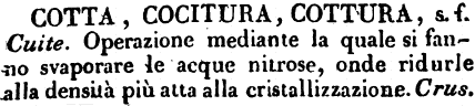 Cotta, Cocitura, Cottura - s. f. Cuite. Operazione mediante la quale si fanno svaporare le acque nitrose, onde ridurle alla densità più atta alla cristallizzazione. Crus. [immagine]