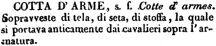 Cotta d'arme - s. f. Cotte d'armes. Sopravveste di tela, di seta, di stoffa, la quale si portava anticamente dai cavalieri sopra l'armatura. [immagine]