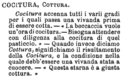 Scottatura, Bollitura, Cocitura, Cottura - Se trattasi di vivande, Scottatura è immergere la carne nell'acqua bollente, acciocchè si conservi di più senza andar a male. - Bollitura è il tenerla a bollire nell'acqua. - Cocitura indica il tempo e il modo del cuocere una vivanda. - «La beccaccia vuole mezz'ora di cocitura.» - La Cottura è il risultato della Cocitura. - «Quando è a giusta cottura, portala in tavola.» [immagine]
