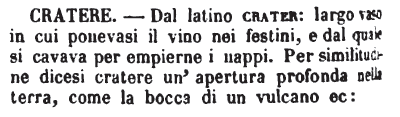 | Cratere - Dal latino crater: largo vaso in cui ponevasi il vino nei festini, e dal quale si cavava per empierne i nappi. Per similitudine dicesi cratere un'apertura profonda nella terra, come la bocca di un vulcano ec: [immagine] |
