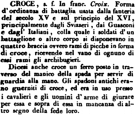 | Croce - s. f. In franc. Croix. Forma d'ordinanza di battaglia usata dalla fanteria del secolo XV e sul principio del XVI, principalmente dagli Svizzeri, dai Guasconi e dagl'Italiani, colla quale i soldati d'un battaglione o altro corpo si disponevano in quattro braccia ovvero rami di picche in forma di croce, ricevendo nel vano di ognuno di essi rami gli archibugieri.