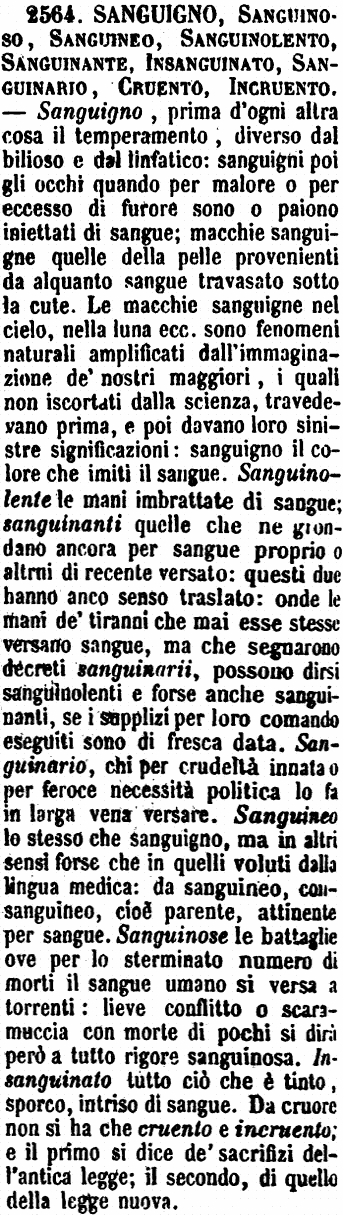 | Sanguigno, Sanguinoso, Sanguineo, Sanguinolento, Sanguinante, Insanguinato, Sanguinario, Cruento, Incruento - Sanguigno, prima d'ogni altra cosa il temperamento, diverso dal bilioso e dal linfatico: sanguigni poi gli occhi quando per malore o per eccesso di furore sono o paiono iniettati di sangue; macchie sanguigne quelle della pelle provenienti da alquanto sangue travasato sotto la cute. Le macchie sanguigne nel cielo, nella luna ecc. sono fenomeni naturali amplificati dall'immaginazione de' nostri maggiori, i quali non iscortati dalla scienza, travedevano prima, e poi davano loro sinistre significazioni: sanguigno il colore che imiti il sangue. Sanguinolente le mani imbrattate di sangue; sanguinanti quelle che ne grondano ancora per sangue proprio o altrui di recente versato: questi due hanno anco senso traslato: onde le mani de' tiranni che mai esse stesse versano sangue, ma che segnarono decreti sanguinarii, possono dirsi sanguinolenti e forse anche sanguinanti, se i supplizi per loro comando eseguiti sono di fresca data. Sanguinario, chi per crudeltà innata o per feroce necessità politica lo fa in larga vena versare. Sanguineo lo stesso che sanguigno, ma in altri sensi forse che in quelli voluti dalla lingua medica: da sanguineo, consanguineo, cioè parente, attinente per sangue. Sanguinose le battaglie ove per lo sterminato numero di morti il sangue umano si versa a torrenti: lieve conflitto o scaramuccia con morte di pochi si dirà però a tutto rigore sanguinosa. Insanguinato tutto ciò che è tinto, sporco, intriso di sangue. Da cruore non si ha che cruento e incruento; e il primo si dice de' sacrifizi dell'antica legge; il secondo, di quello della legge nuova. [immagine] |