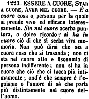 | Essere a cuore, Star a cuore, Aver nel cuore - È a cuore cosa o persona per la quale si prende vivo ed efficace interessamento. Sta nel cuore acerba puntura, o dolce ricordo; si ha in cuore ciò di che si serba viva memoria. Non può dirsi che sia a cuore cosa che si trasanda; non ci sta nel cuore atto o fisonomia di persona indifferente; non si ha in cuore che ciò che ci tocca più intimamente; ond'è che sempre è l'egoismo o l'amore di sè che parla più distintamente nel cuore dell'uomo. [immagine] |