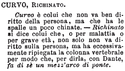| Curvo, Richinato - Curvo è colui che non va ben diritto della persona, ma che ha le spalle un poco chinate. - Richinato si dice colui che, o per malattia o per grave età, non solo non va diritto sulla persona, ma ha eccessivamente ripiegata la colonna vertebrale per modo che, per dirla, con Dante, fa di sè un mezz'arco di ponte. [immagine] |