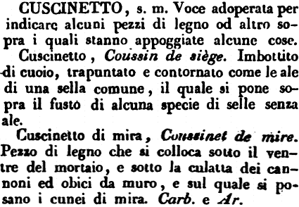 Cuscinetto di mira, Coussinet de mire. Pezzo di legno che si colloca sotto il ventre del mortaio, e sotto la culatta dei cannoni ed obici a muro, e sul quale si posano i cunei di mira. Carb. e Ar. [immagine]