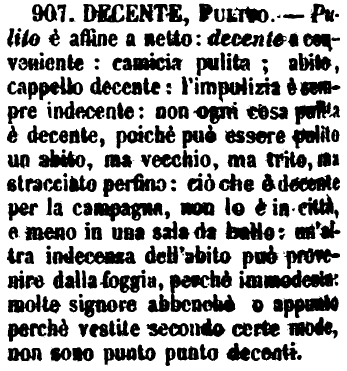 | Decente, Pulito - Pulito è affine a Netto: Decente a Conveniente: camicia pulita; abito, cappello decente. L'impulizia è sempre indecente: non ogni cosa pulita è decente, poichè può essere pulito un abito, ma vecchio, ma trito, ma stracciato perfino: ciò che è decente per la campagna, non è tale in città, e meno in una sala da ballo: un'altra indecenza dell'abito, può provenire dalla foggia, perchè immodesta: molte signore, benchè, o appunto perchè vestite secondo certe mode, non sono punto decenti. (Zecchini). [immagine] |