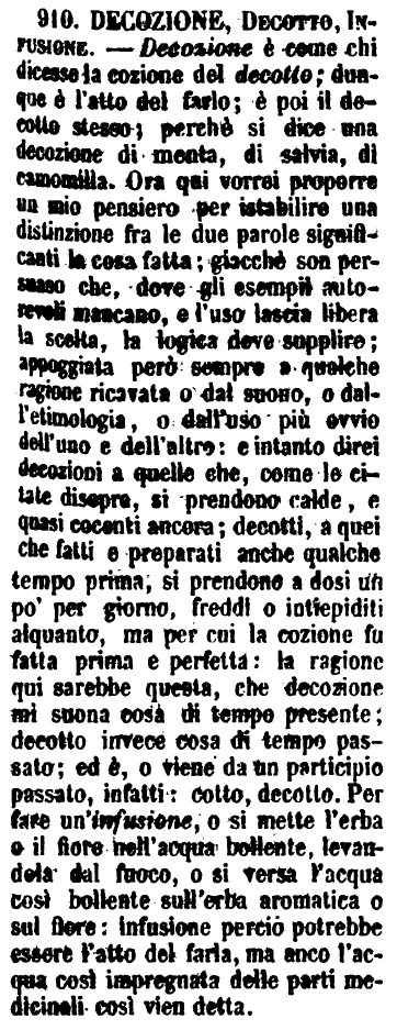 | Decozione, Decotto, Infusione - Decozione è come chi dicesse la cozione del decotto; dunque è l'atto del farlo; è poi il decotto stesso; perché si dice una decozione di menta, di salvia, di camomilla. Ora qui vorrei proporre un mio pensiero per istabilire una distinzione fra le due parole significanti la cosa fatta; giacchè son persuaso che, dove gli esempii autorevoli mancano, e l'uso lascia libera la scelta, la logica deve supplire; appoggiata però sempre a qualche ragione ricavata o dal suono, o dall'etimologia, o dall'uso più ovvio dell'uno e dell'altro: e intanto direi decozioni a quelle che, come le citate disopre, si prendono calde, e quasi cocenti ancora; decotti, a quei che fatti e preparati anche qualche tempo prima, si prendono a dosi un po' per giorno, freddi o intiepiditi alquanto, ma per cui la cozione fu fatta prima e perfetta: la ragione qui sarebbe questa, che decozione mi suona cosa di tempo presente; decotto invece cosa di tempo passato; ed è, o viene da un participio passato, infatti: cotto, decotto. Per fare un'infusione, o si mette l'erba o il fiore nell'acqua bollente, levandola dal fuoco, o si versa l'acqua così bollente sull'erba aromatica o sul fiore: infusione perciò potrebbe essere l'atto del farla, ma anco l'acqua così impregnata delle parti medicinali così vien detta. [immagine] |