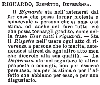 | Riguardo, Rispetto, Deferenza - Il Riguardo sta nell'astenersi dal far cosa che possa tornar molesta o spiacevole a persona che si ama o si stima, od anche nel fare tutto ciò che possa tornargli gradito, come nella frase Usar tutti i riguardi. - Sta il Rispetto nell'usare ogni atto di riverenza a persona che lo merita, astenendosi altresì da ogni altro atto men che dicevole alla sua qualità. - La Deferenza sta nel seguitare le altrui proposte o consigli, non per esserne persuaso, ma per la stima e per l'affetto che abbiamo per esso, e per non disgustarlo. [immagine] |