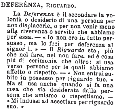 | Deferenza, Riguardo - La Deferenza è il secondare la volontà o desiderio di una persona per non dispiacerle, o per non venir meno alla riverenza o servitù che abbiamo per essa. - «Io non ero in tutto persuaso, ma lo feci per deferenza al signor I.» - Il Riguardo sta, più che nel fare, nel non fare, ed è cosa più di cerimonia che altro: si usa verso persone per le quali abbiamo affetto o rispetto. - «Non entrai subito in possesso per riguardo tuo.» Ma si usa anche quando si fa una cosa che sia desiderata dalla persona che amiamo o rispettiamo. - «Mi indussi ad accettare per riguardo suo.» [immagine] |
