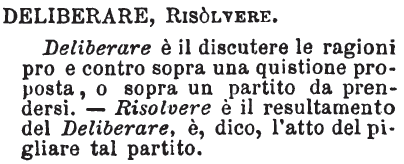 | Deliberare, Risolvere - Deliberare è il discutere le ragioni pro e contro sopra una quistione proposta, o sopra un partito da prendersi. - Risolvere è il resultamento del Deliberare, è, dico, l'atto del pigliare tal partito. [immagine] |