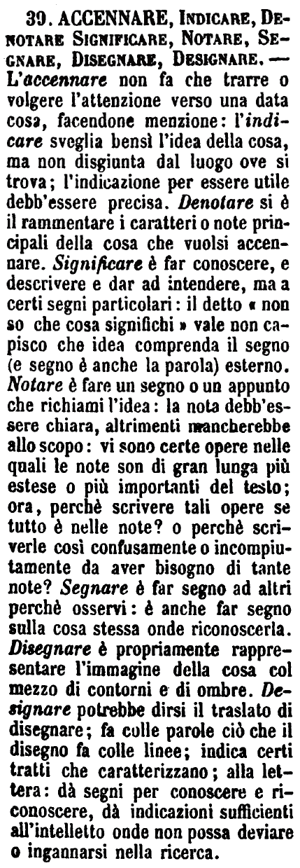 | Accennare, Indicare, Denotare, Significare, Notare, Segnare, Disegnare, Designare - L'accennare non fa che trarre o volgere l'attenzione verso una data cosa, facendone menzione: l'indicare sveglia bensì l'idea della cosa, ma non disgiunta dal luogo ove si trova; l'indicazione per essere utile debb'essere precisa. Denotare si è il rammentare i caratteri o note principali della cosa che vuolsi accennare. Significare è far conoscere, e descrivere e dar ad intendere, ma a certi segni particolari: il detto « non so che cosa significhi » vale non capisco che idea comprenda il segno (e segno è anche la parola) esterno. Notare è fare un segno o un appunto che richiami l'idea: la nota debb'essere chiara, altrimenti mancherebbe allo scopo: vi sono certe opere nelle quali le note son di gran lunga più estese o più importanti del testo; ora, perchè scrivere tali opere se tutto è nelle note? o perchè scriverle così confusamente o incompiutamente da aver bisogno di tante note? Segnare è far segno ad altri perchè osservi: è anche far segno sulla cosa stessa onde riconoscerla. Disegnare è propriamente rappresentare l'immagine della cosa col mezzo di contorni e di ombre. Designare potrebbe dirsi il traslato di disegnare; fa colle parole ciò che il disegno fa colle linee; indica certi tratti che caratterizzano; alla lettera: dà segni per conoscere e riconoscere, dà indicazioni sufficienti all'intelletto onde non possa deviare o ingannarsi nella ricerca. [immagine] |