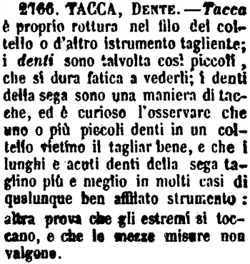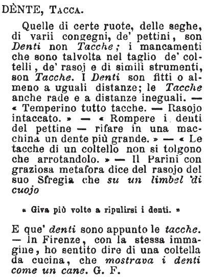 Dente, Tacca - Quelle di certe ruote, delle seghe, di varii congegni, de' pettini, son Denti non Tacche; i mancamenti che sono talvolta nel taglio de' coltelli, de' rasoj e di simili strumenti, son Tacche. I Denti son fitti o almeno a uguali distanze; le Tacche anche rade e a distanze ineguali. — «Temperino tutto tacche. — Rasojo intaccato.» — «Rompere i denti del pettine — rifare in una macchina un dente più grande.» — «Le tacche di un coltello non si tolgono che arrotandolo.» — Il Parini con graziosa metafora dice del rasojo del suo Sfregia che su un limbel di cuojo