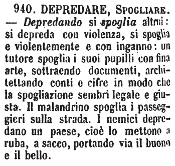 Depredare, Spogliare - Depredando si spoglia altrui: si depreda con violenza, si spoglia e violentemente e con inganno: un tutore spoglia i suoi pupilli con fina arte, sottraendo documenti, architettando conti e cifre in modo che la spogliazione sembri legale e giusta. Il malandrino spoglia i passeggieri sulla strada. I nemici depredano un paese, cioè lo mettono a ruba, a sacco, portando via il buono e il bello. [immagine]