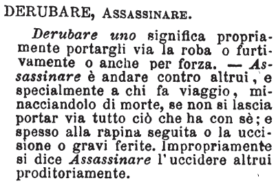 | Derubare, Assassinare - Derubare uno significa propriamente portargli via la roba o furtivamente o anche per forza. - Assassinare è andare contro altrui, e specialmente a chi fa viaggio, minacciandolo di morte, se non si lascia portar via tutto ciò che ha con sè; e spesso alla rapina seguita o la uccisione o gravi ferite. Impropriamente si dice Assassinare l'uccidere altrui proditoriamente. [immagine] |