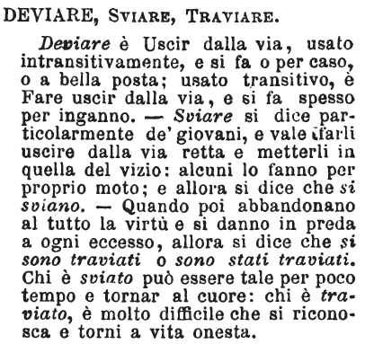 Deviare, Sviare, Traviare - Deviare è Uscir dalla via, usato intransitivamente, e si fa o per caso, o a bella posta; usato transitivo, è Fare uscir dalla via, e si fa spesso per inganno. - Sviare si dice particolarmente de' giovani, e vale farli uscire dalla via retta e metterli in quella del vizio: alcuni lo fanno per proprio moto; e allora si dice che si sviano. - Quando poi abbandonano al tutto la virtù e si danno in preda a ogni eccesso, allora si dice che si sono traviati o sono stati traviati. Chi è sviato può essere tale per poco tempo e tornar al cuore: chi è traviato, è molto difficile che si riconosca e torni a vita onesta. [immagine]