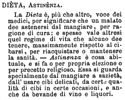 | Dieta, Astinenza - La Dieta è, più che altro, voce dei medici, per significare che un malato dee astenersi dal mangiare, per ragione di cura; e spesso vale altresì quel regime di vita che alcuno dee tenere, massimamente rispetto al cibarsi, per riacquistare o mantenere la sanità. - Astinenza è cosa abituale, e si fa o per propria elezione o per precetto religioso. Essa si guarda specialmente dal mangiare a sazietà, dall'usare cibi delicati, da certe qualità di cibi in certe occasioni, e anche da bevande di vino e liquori. [immagine] |