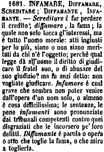Infamare, Diffamare, Screditare; Diffamante, Infamante - Screditare è far perdere il credito; diffamare, la fama; la quale non solo tocca gl'interessi, ma è tutto l'uomo morale: atti ingiusti per lo più, siano o non siano meritati da chi n'è l'oggetto; perchè qual legge dà all'uomo il diritto di giudicare il fratel suo, o di abusare del suo giudizio? ma fu anzi detto: non vogliate giudicare. Infamare è così grave che sembra non poter venire dall'opera d'un uom solo, o almeno è cosa difficilissima; le sentenze, le pene infamanti sono pronunziate dai tribunali competenti contro quei disgraziati che le incorsero pe' loro delitti. Diffamante è parola o opera o atto che toglie la fama, o che mira a toglierla. [immagine]