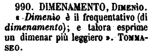 | Dimenamento, Dimenìo - «Dimenìo è il frequentativo (di dimenamento); e talora esprime un dimenar più leggiero». Tommaseo. [immagine] |
