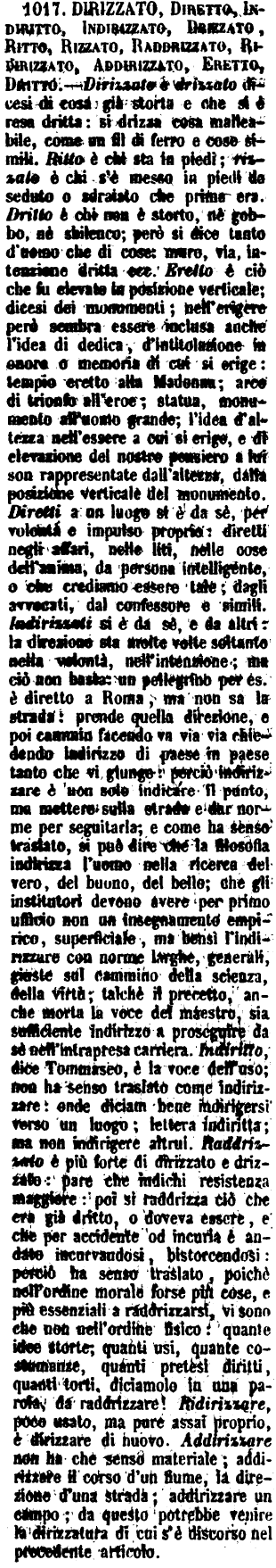 | Dirizzato, Diretto, Indiritto, Indirizzato, Drizzato, Ritto, Rizzato, Raddrizzato, Ridirizzato, Addirizzato, Eretto, Dritto - Dirizzato e drizzato dicesi di cosa già storta e che si è resa dritta: si drizza cosa malleabile, come un fil di ferro e cose simili. Ritto è chi sta in piedi; rizzato è chi s’è messo in piedi da seduto o sdraiato che prima era. Dritto è chi non è storto, nè gobbo, nè sbilenco; però si dice tanto d’uomo che di cose: muro, via, intenzione dritta ecc. Eretto è ciò che fu elevato in posizione verticale; dicesi dei monumenti; nell’erigere però sembra essere inclusa anche l’idea di dedica, d’intitolazione in onore o memoria di cui si erige: tempio eretto alla Madonna; arco di trionfo all’eroe; statua, monumento all’uomo grande; l’idea d’altezza nell’essere a cui si erige, e di elevazione del nostro pensiero a lui son rappresentate dall’altezza, dalla posizione verticale del monumento. Diretti a un luogo si è da sè, per volontà e impulso proprio: diretti negli affari, nelle liti, nelle cose dell’anima, da persona intelligente, o che crediamo essere tale; dagli avvocati, dal confessore e simili. Indirizzati si è da sè, e da altri: la direzione sta molte volte soltanto nella volontà, nell’intenzione; ma ciò non basta: un pellegrino per es. è diretto a Roma, ma non sa la strada: prende quella direzione, e poi cammin facendo va via via chiedendo indirizzo di paese in paese tanto che vi giunge: perciò indirizzare è non solo indicare il punto, ma mettere sulla strada e dar norme per seguitarla; e come ha senso traslato, si può dire che la filosofia indirizza l’uomo nella ricerca del vero, del buono, del bello; che gli institutori devono avere per primo ufficio non un insegnamento empirico, superficiale, ma bensì l’indirizzare con norme larghe, generali, giuste sul cammino della scienza, della virtù; talchè il precetto, anche morta la voce del maestro, sia sufficiente indirizzo a proseguire da sè nell’intrapresa carriera. Indiritto, dice Tommaseo, è la voce dell’uso; non ha senso traslato come indirizzare: onde diciam bene indirigersi verso un luogo; lettera indiritta; ma non indirigere altrui. Raddrizzato è più forte di dirizzato e drizzato: pare che indichi resistenza maggiore: poi si raddrizza ciò che era già dritto, o doveva essere, e che per accidente od incuria è andato incurvandosi, bistorcendosi: perciò ha senso traslato, poichè nell’ordine morale forse più cose, e più essenziali a raddrizzarsi, vi sono che non nell’ordine fisico: quante idee storte, quanti usi, quante costumanze, quanti pretesi diritti, quanti torti, diciamolo in una parola, da raddrizzare! Ridirizzare, poco usato, ma pure assai proprio, è dirizzare di nuovo. Addirizzare non ha che senso materiale; addirizzare il corso d’un fiume, la direzione d’una strada; addirizzare un campo; da questo potrebbe venire la dirizzatura di cui s’è discorso nel precedente articolo. [immagine] |