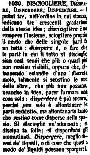 | Disciogliere, Dissipare, Disperdere, Dispergere - I primi tre, nell'ordine in cui stanno, indicano tre crescenti gradazioni della stessa idea; disciogliere è un rompere l'insieme, sciogliere proprio il nesso che delle singole parti fa un tutto: dissipare è, o fare che le parti in cui il tutto si dicioglie sian così tenui che più o quasi più non restino visibili, oppure che, rimanendo eziandio d'una discreta mole, talmente si scostino le une dalle altre, che più non possano, neanche in idea, parer formare una cosa sola: disperdere è più ancora, perchè non solo è allontanare le parti suddette, ma allontanarle tanto che restino come disperse nello spazio. Si discioglie un'adunanza; si dissipa la folla; si disperdono gli ammutinati. Dispergere, meglio dicesi de' liquidi, o di cose che quasi a modo de' liquidi possano spargersi. [immagine] |