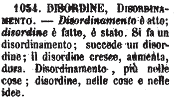 | Disordine, Disordinamento - Disordinamento è atto; disordine è fatto, è stato. Si fa un disordinamento; succede un disordine; il disordine cresce, aumenta, dura. Disordinamento, più nelle cose; disordine, nelle cose e nelle idee. [immagine] |