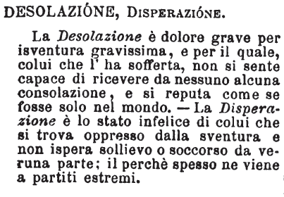 Desolazione, Disperazione - La Desolazione è dolore grave per isventura gravissima, e per il quale, colui che l'ha sofferta, non si sente capace di ricevere da nessuno alcuna consolazione, e si reputa come se fosse solo nel mondo. - La Disperazione è lo stato infelice di colui che si trova oppresso dalla sventura e non ispera sollievo o soccorso da veruna parte; il perchè spesso ne viene a partiti estremi. [immagine]