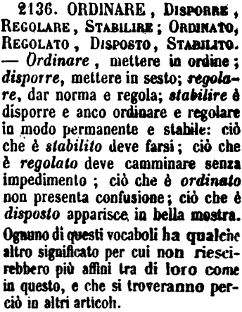 | Ordinare, Disporre, Regolare, Stabilire; Ordinato, Regolato, Disposto, Stabilito - Ordinare, mettere in ordine; disporre, mettere in sesto; regolare, dar norma e regola; stabilire è disporre e anco ordinare e regolare in modo permanente e stabile; ciò che è stabilito deve farsi; ciò che è regolato deve camminare senza impedimento; ciò che è ordinato non presenta confusione; ciò che è disposto apparisce in bella mostra. Ognuno di questi vocaboli ha qualche altro significato per cui non riescirebbero più affini tra di loro come in questo, e che si troveranno perciò in altri articoli. [immagine] |