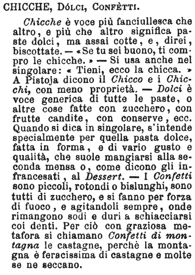 | Chicche, Dolci, Confetti - Chicche è voce più fanciullesca che altro, e più che altro significa paste dolci, ma assai cotte, e, direi, biscottate. - « Se tu sei buono, ti compro le chicche. » - Si usa anche nel singolare: « Tieni, ecco la chicca. » A Pistoja dicono il Chicco e i Chicchi, con meno proprietà. - Dolci è voce generica di tutte le paste, o altre cose fatte con zucchero, con frutte candite, con conserve, ecc. Quando si dica in singolare, s'intende specialmente per quella pasta dolce, fatta in forma, e di vario gusto e qualità, che suole mangiarsi alla seconda mensa o, come dicono gli infrancesati, al Dessert. - I Confetti sono piccoli, rotondi o bislunghi, sono tutti di zucchero, e si fanno per forza di fuoco, e agitandoli sempre, onde rimangono sodi e duri a schiacciarsi coi denti. Per ciò con graziosa metafora si chiamano Confetti di montagna le castagne, perchè la montagna è feracissima di castagne e molte se ne seccano. [immagine] |