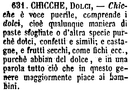| Chicche, Dolci - Chicche è voce puerile, comprende i dolci, cioè qualunque maniera di paste sfogliate o d'altra specie purchè dolci, confetti e simili; e castagne, e frutti secchi, come fichi ecc., purchè abbian del dolce, e in una parola tutto ciò che in questo genere maggiormente piace ai bambini. [immagine] |