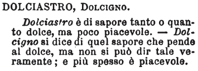| Dolciastro, Dolcigno - Dolciastro è il sapore tanto o quanto dolce, ma poco piacevole. - Dolcigno si dice di quel sapore che pende al doce, ma non si può dir tale veramente; e più spesso è piacevole. [immagine] |