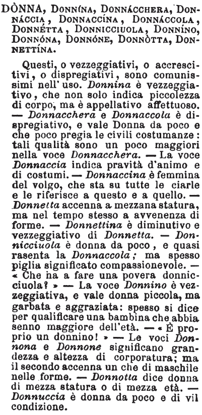 Donna, Donnina, Donnacchera, Donnaccia, Donnaccina, Donnaccola, Donnetta, Donnicciuola, Donnino, Donnona, Donnone, Donnotta, Donnettina - Questi, o vezzeggiativi, o accrescitivi, o dispregiativi, sono comunissimi nell'uso. Donnina è vezzeggiativo, che non solo indica piccolezza di corpo, ma è appellativo affettuoso. - Donnacchera e Donnaccola è dispregiativo, e vale Donna da poco e che poco pregia le civili costumanze: tali qualità sono un poco maggiori nella voce Donnacchera. - La voce Donnaccia indica pravità d'animo e di costumi. - Donnaccina è femmina del volgo, che sta su tutte le ciarle e le riferisce a questo e a quello. - Donnetta accenna a mezzana statura, ma nel tempo stesso a avvenenza di forme. - Donnettina è diminutivo e vezzeggiativo di Donnetta. - Donnicciuola è donna da poco, e quasi rasenta la Donnaccola; ma spesso piglia significato compassionevole. - « Che ha a fare una povera donnicciuola ? » - La voce Donnino è vezzeggiativa, e vale donna piccola, ma garbata e aggraziata: spesso si dice per qualificare una bambina che abbia senno maggiore dell'età. - « È proprio un donnino! » - Le voci Donnona e Donnone significano grandezza e altezza di corporatura; ma il secondo accenna un che di maschile nelle forme. - Donnotta dice donna di mezza statura o di mezza età. - Donnuccia è donna da poco e di vil condizione. [immagine]