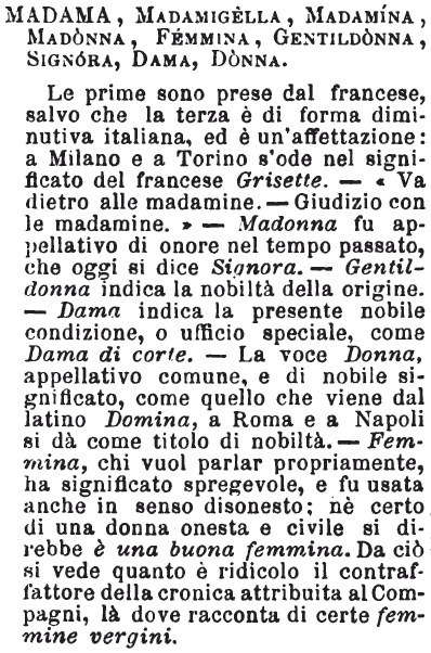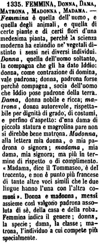 Madama, Madamigella, Madamina, Madonna, Femmina, Gentildonna, Signora, Dama, Donna - Le prime sono prese dal francese, salvo che la terza è di forma diminutiva italiana, ed è un'affettazione: a Milano e a Torino s'ode nel significato del francese Grisette. - « Va dietro alle madamine. - Giudizio con le madamine. » - Madonna fu appellativo di onore nel tempo passato, che oggi si dice Signora. - Gentildonna indica la nobiltà della origine. - Dama indica la presente nobile condizione, o ufficio speciale, come Dama di corte. - La voce Donna, appellativo comune, e di nobile significato, come quello che viene dal latino Domina, a Roma e a Napoli si dà come titolo di nobiltà. - Femmina, chi vuol parlar propriamente, ha significato spregevole, e fu usata anche in senso disonesto; nè certo di una donna onesta e civile si direbbe è una buona femmina. Da ciò si vede quanto è ridicolo il contraffattore della cronica attribuita al Compagni, là dove racconta di certe femmine vergini. [immagine]