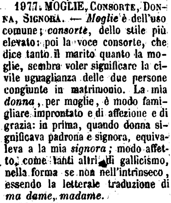 Moglie, Consorte, Donna, Signora - Moglie è dell'uso comune; consorte, dello stile più elevato: poi la voce consorte, che dice tanto il marito quanto la moglie, sembra voler significare la civile uguaglianza delle due persone congiunte in matrimonio. La mia donna, per moglie, è modo famigliare improntato e di affezione e di grazia: in prima, quando donna significava padrona e signora, equivaleva a la mia signora; modo affetto, come tanti altri, di gallicismo, nella forma se non nell'intrinseco, essendo la letterale traduzione di ma dame, madame. [immagine]