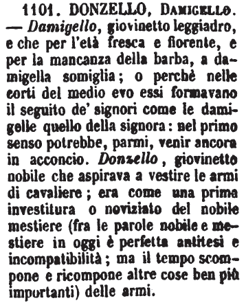 Donzello, Damigello - Damigello, giovinetto leggiadro, e che per l'età fresca e fiorente, e per la mancanza della barba, a damigella somiglia; o perchè nelle corti del medio evo essi formavano il seguito de' signori come le damigelle quello della signora: nel primo senso potrebbe, parmi, venir ancora in acconcio. Donzello, giovinetto nobile che aspirava a vestire le armi di cavaliere; era come una prima investitura o noviziato del nobile mestiere (fra le parole nobile e mestiere in oggi è perfetta antitesi e incompatibilità; ma il tempo scompone e ricompone altre cose ben più importanti) delle armi. [immagine]